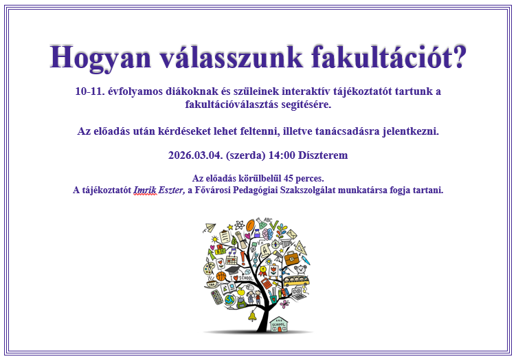 10-11. évfolyamos diákoknak és szüleinek interaktív tájékoztatót tartunk a fakultációválasztás segítésére.