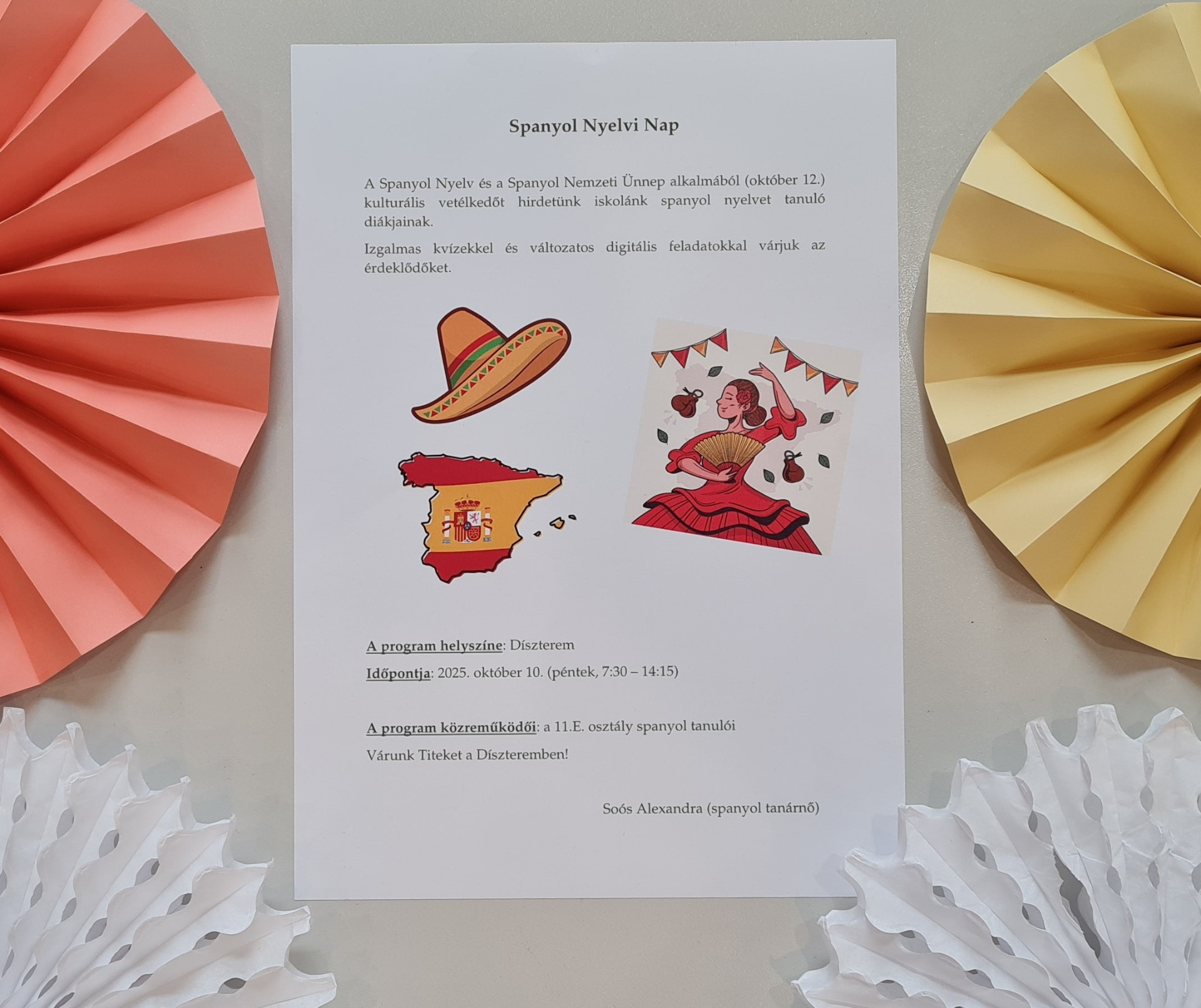 Iskolánkban idén is megrendezésre került a Spanyol Nyelv és Kultúra Napja, amely során diákjaink játékos és tartalmas programokon keresztül ismerkedhettek meg a spanyol nyelv és hagyományok sokszínű világával. A rendezvény részletes beszámolója az alábbi linken olvasható: https://www.moricz-bp.hu/nemet-olasz-spanyol/