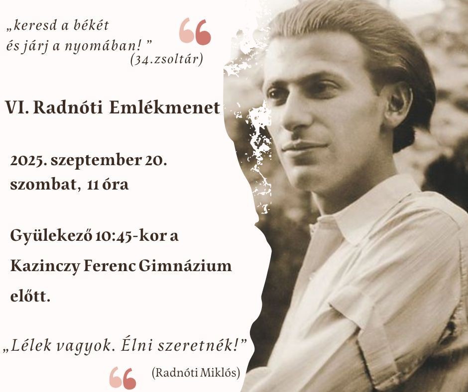 Idén már hatodik alkalommal várjuk Győrbe a Kárpát-medence diákjait és felnőtteit, hogy a Kazinczy Gimnáziumtól elindulva, érintve a Melocco Miklós által készített Radnóti-szobrot, az abdai Radnóti Emlékhelyen együtt emlékezzünk a Költőre és a háború ártatlan áldozataira.
