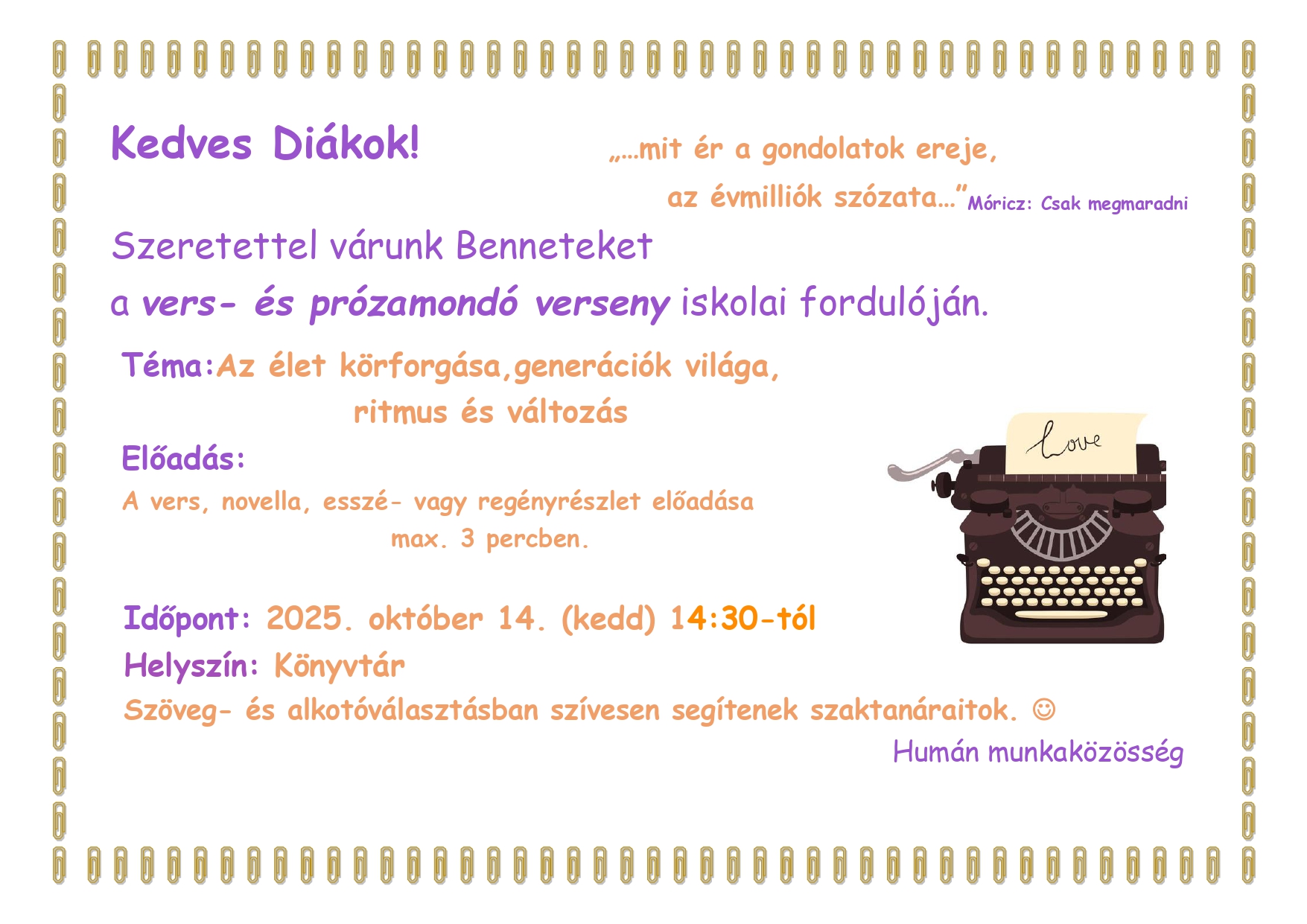 A verseny időpontja, helyszíne: 2025. november 13. (csütörtök) 15:00 - Könyvtár