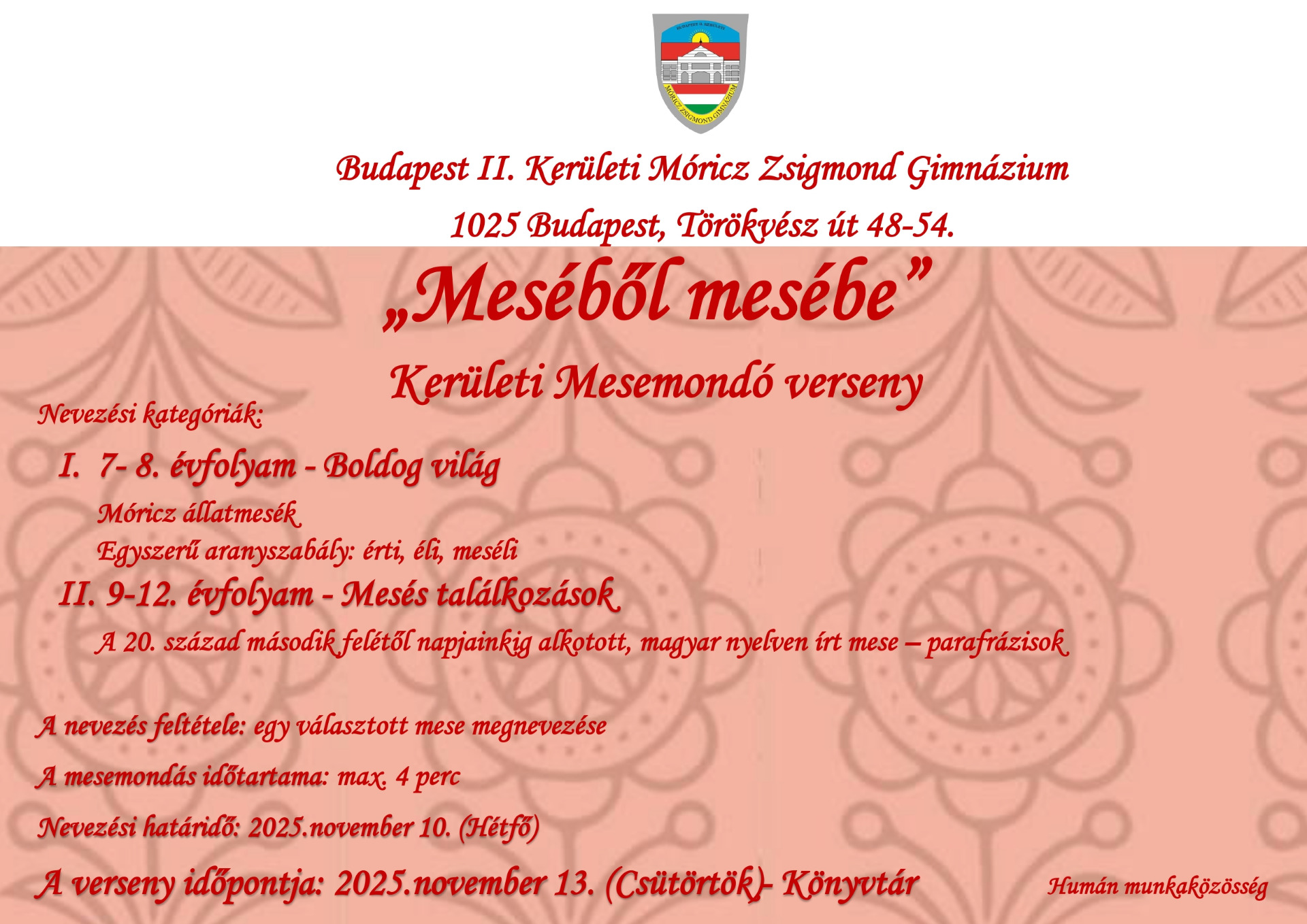 A Budapest II. Kerületi Móricz Zsigmond Gimnázium "Meséből mesébe" címmel Kerületi Mesemondó versenyt hirdet.