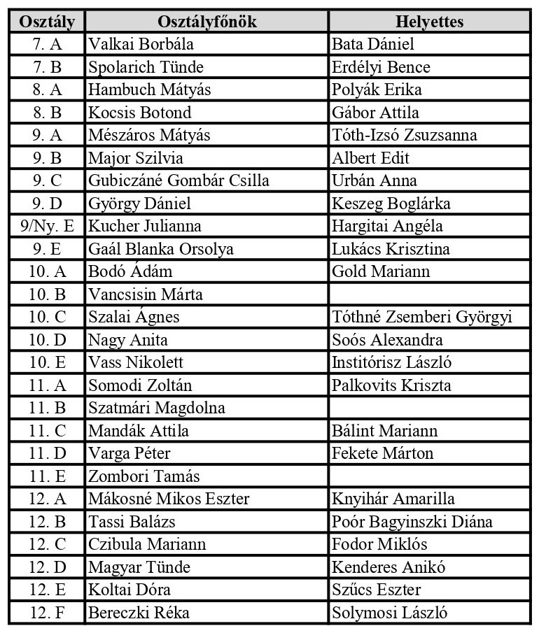 Osztályfőnökök és helyetteseik